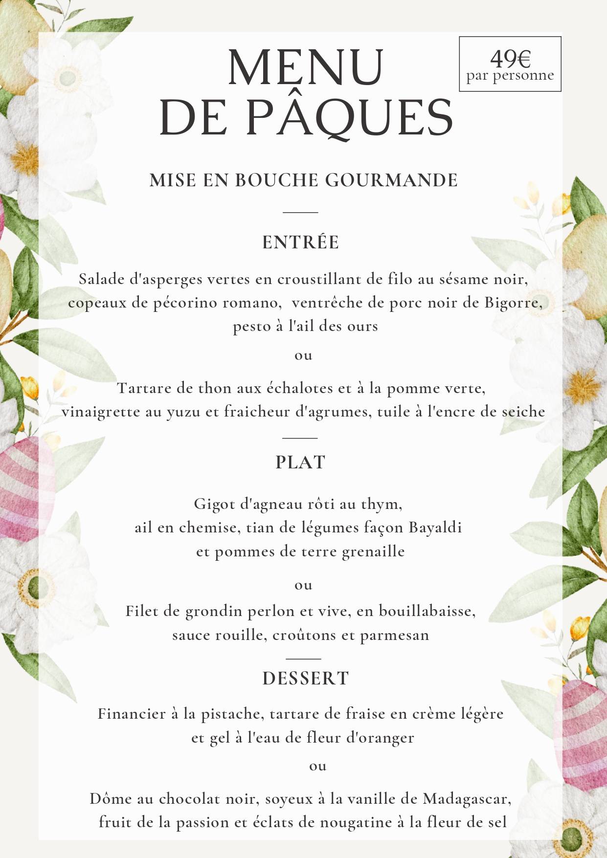 Élaboré avec des produits de saison et une touche de créativité, ce menu met à l’honneur une cuisine gourmande et raffinée. Dans une ambiance chaleureuse et conviviale, venez partager un moment d’exception autour d’une table festive.